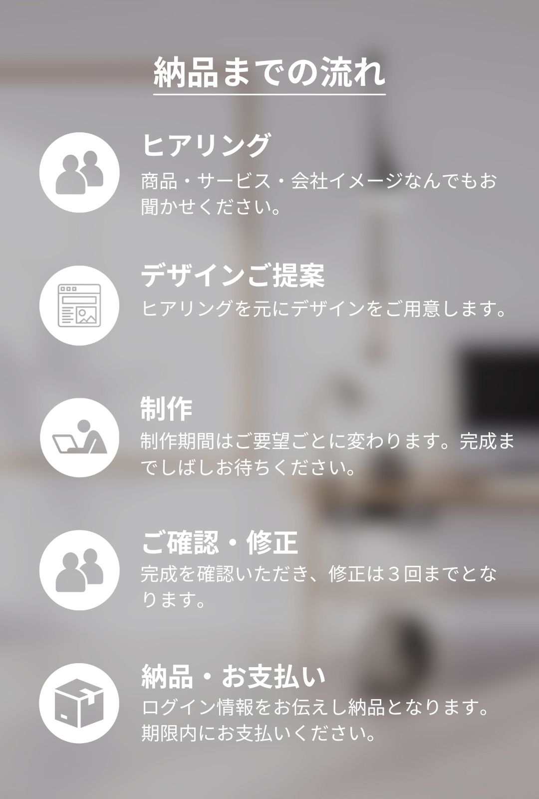 ご確認いただくために打合せ(3~4回まで)をお願いします。修正は3回までとなります。